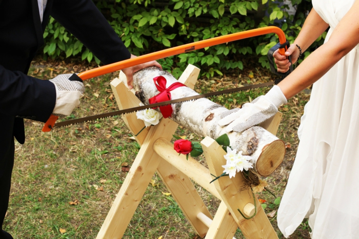 Der baumstamm auf dem sägebock symbolisiert ein hindernis und eine sperre für den weg in die ehe. Braut und bräutigam sägen gemeinsam nach der. Ihr seid auf einer hochzeit eingeladen und sucht noch ein lustiges spiel für direkt.